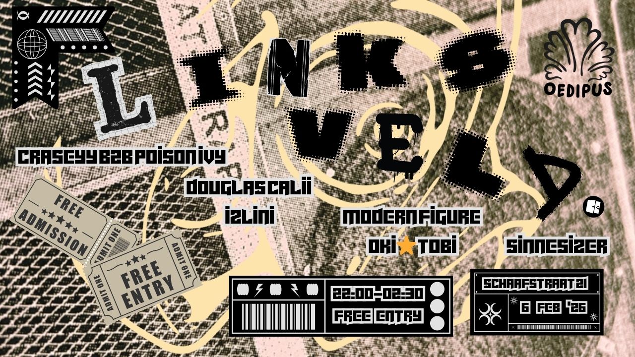 Experimental, progressive, weird and loud, that's the spirit of LinksVeld. With this free party we’re showcasing the unheard and underappreciated sounds of the underground. Live- and DJ sets spanning breaks, bass, idm and tekno. Not to mention a live performance by a new band serving new-wave-synth-punk related sounds. Come dance for free and enjoy some Oedipus specials.